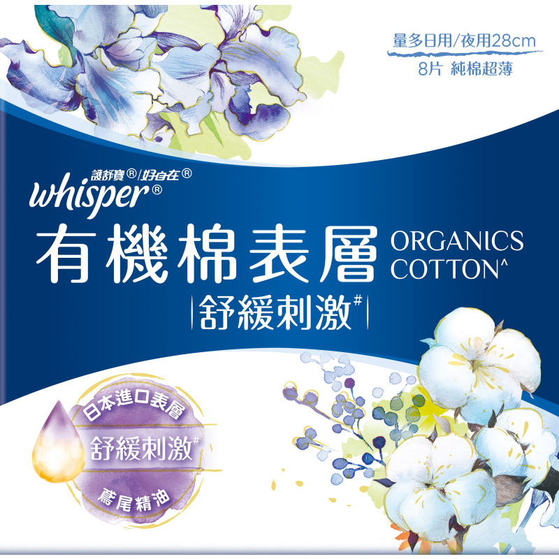 自營 香港倉 Whisper 護舒寶有機絲薄衛生巾(舒緩刺激)28cm 8片