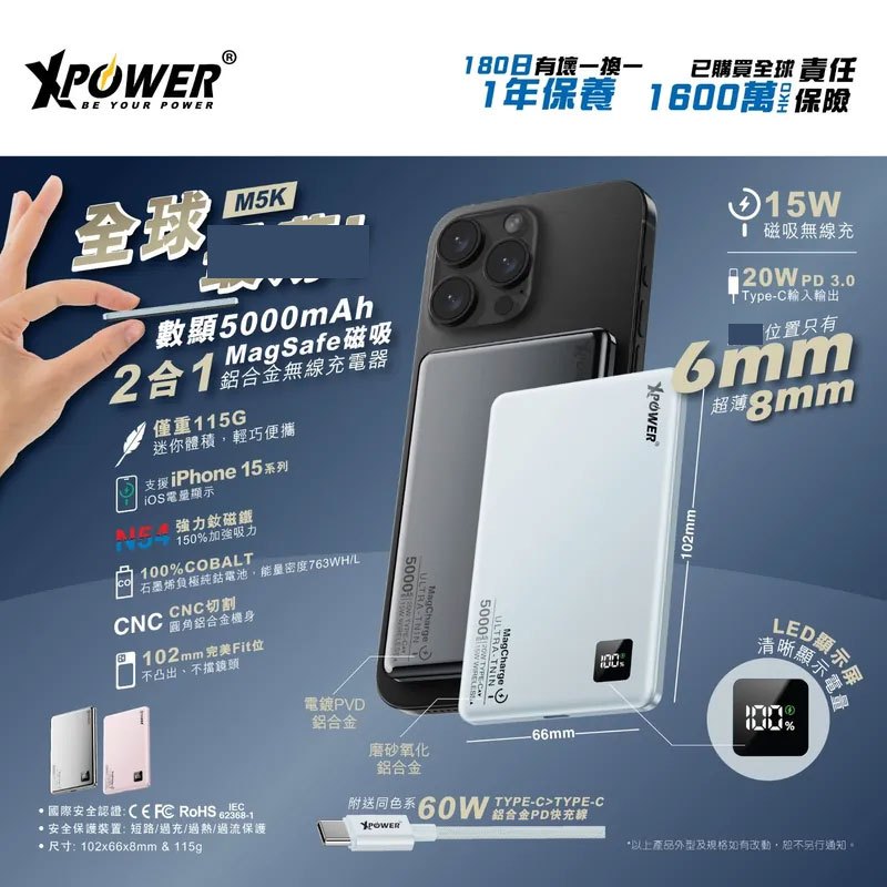 自營 香港倉 XPower M5K 2合1鋁合金數顯 5000mAh PD3.0+磁吸無線外置充電器 粉色