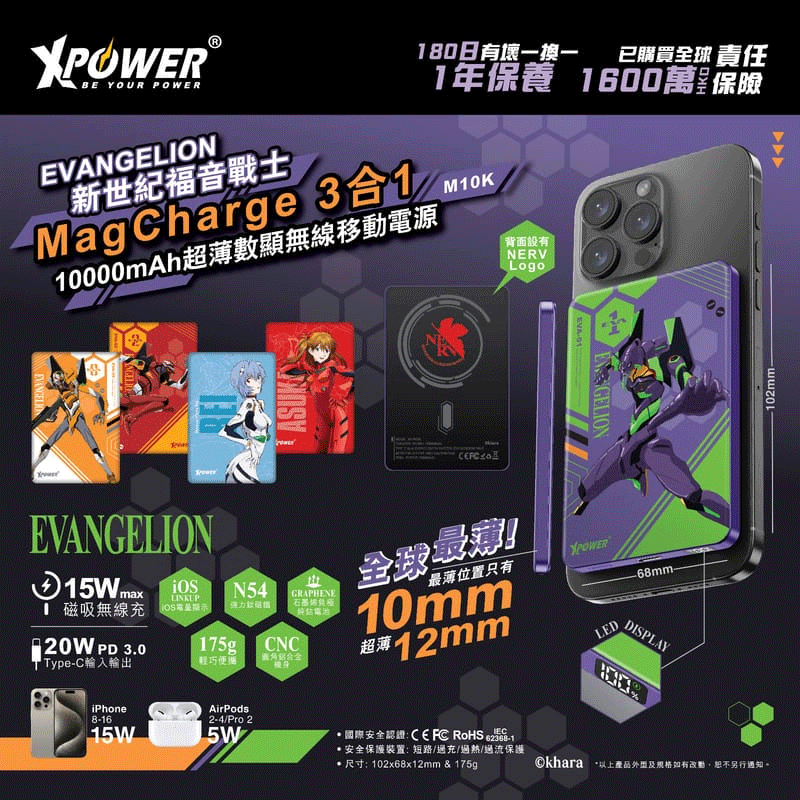 自營 香港倉 EVA新世紀福音戰士 3合1 10000mAh超薄數顯無線充電器(M10K) 紫色