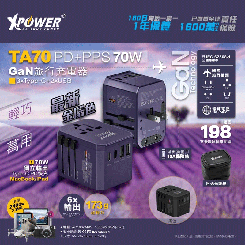 自營 香港倉 XPower TA70 6輸出PD/PPS 70W Gan旅行充電器 紫色