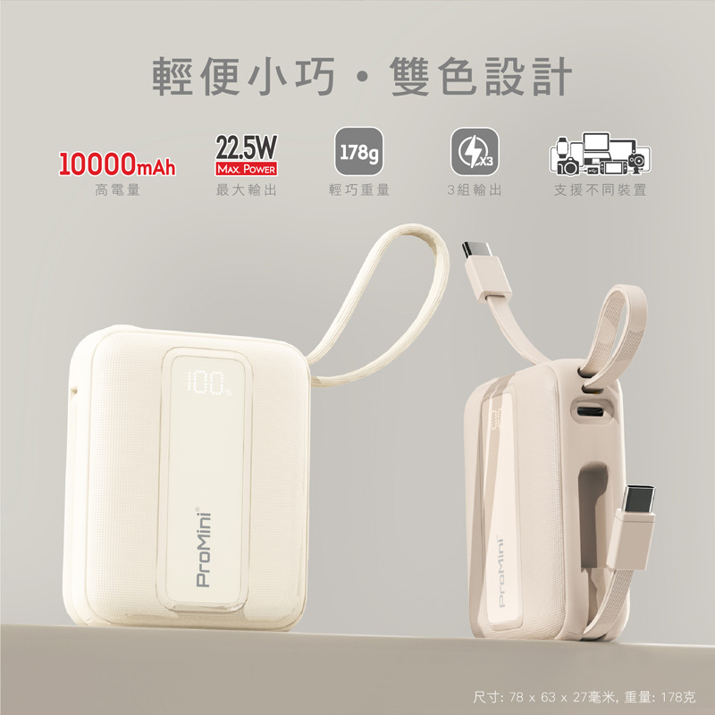 自營 香港倉 ProMini 10DC 內置線10000mAh快速充電流動電池 米色