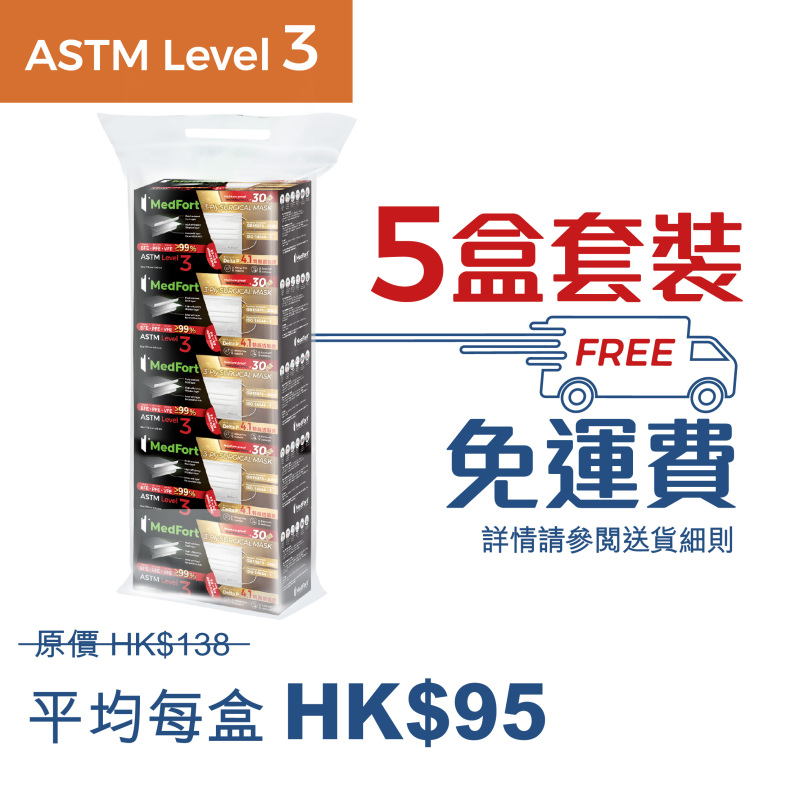 醫堡 MedFort - 香港製造 ASTM Level 3 口罩 - 5盒裝 (獨立包裝 X 30片/盒)